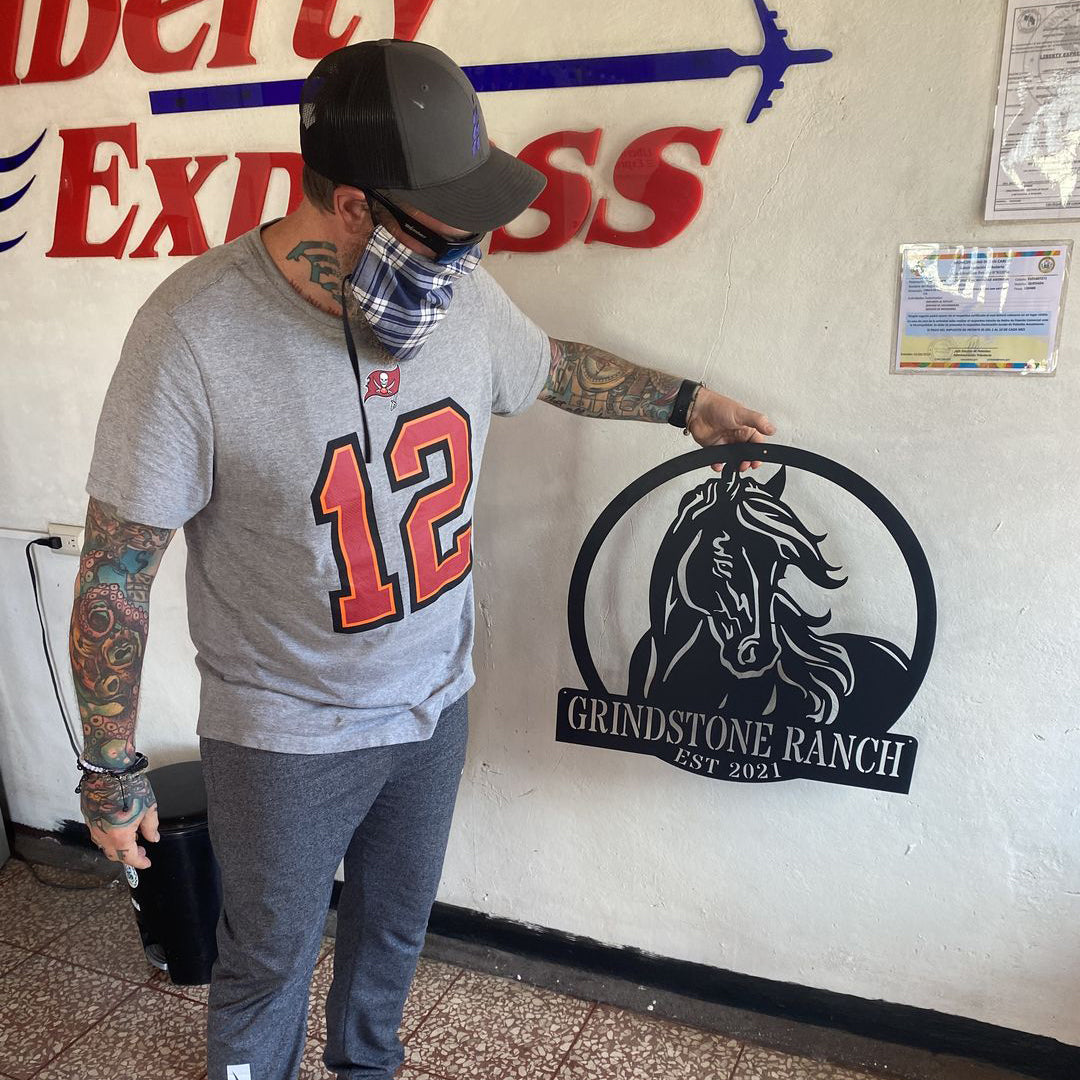 This metal sign, perfect for horse lovers and ranch owners, adds a personalized touch to any space. Made with durable materials, it's the perfect addition to any ranch decor. Show off your love for horses with this custom piece.